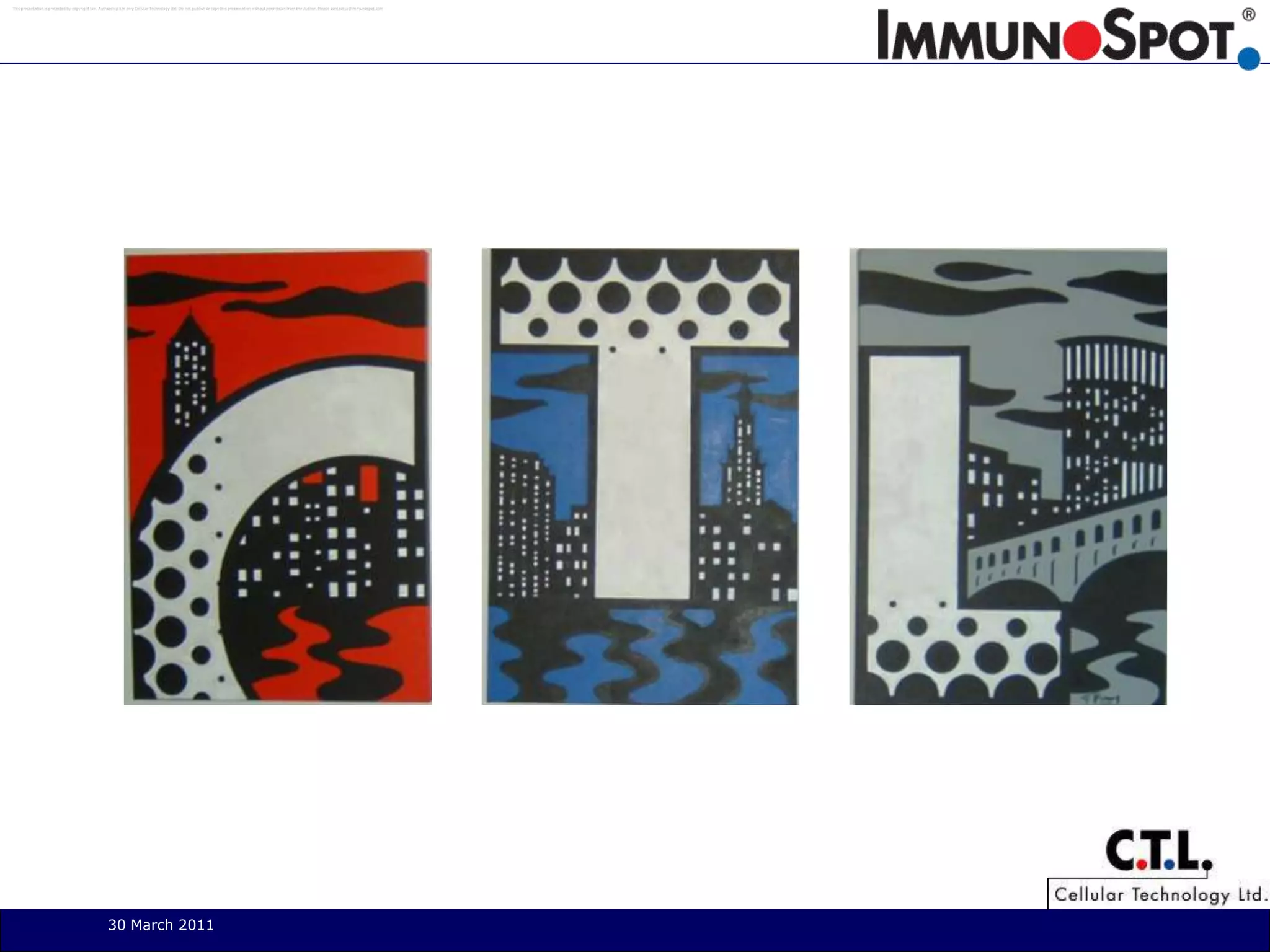 This document discusses Cellular Technology Ltd.'s elevation of ELISPOT assays to an exact science through various imaging technologies. It features unprocessed and counted images from dual color ELISPOT, viral plaque assays with crystal violet and ICA staining, dual and triple color UV-Spot assays, dual color UV cell cycle assays, reporter gene expression assays, and cell counting assays. Further information is available at www.immunospot.com or by contacting CTL Analyzers LLC.