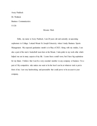 Avery Paddock is a 20-year-old upcoming sophomore studying Business Sports Management at Mount St. Joseph University who expects to graduate in May 2023. He is a member of the men's basketball team and takes pride in his strong work ethic, which has helped him succeed in multiple areas of his life. He comes from a small town but has big aspirations for his future and believes he can be an essential member and top performer for any company due to his competitiveness, work ethic, and personable nature.