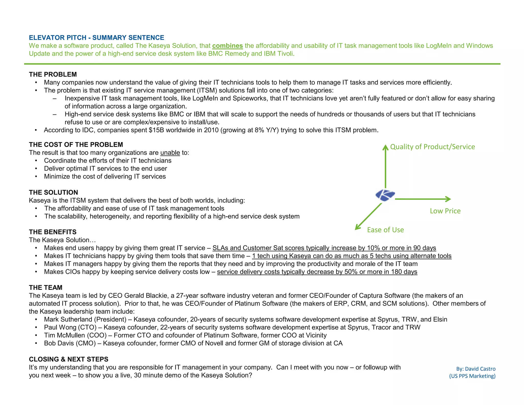 Kaseya offers a software product that merges the affordability and usability of IT task management tools with the capabilities of high-end service desk systems, addressing the limitations of existing IT service management solutions. This system enables efficient coordination of IT technicians, improves service delivery, and reduces costs significantly. The Kaseya leadership team, led by CEO Gerald Blackie, boasts extensive experience in software development, aiming to enhance IT management across organizations.
