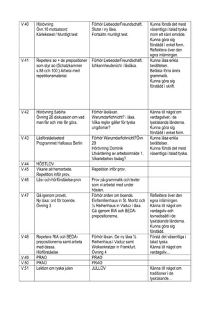 Elevens val ty9<br />http://www2.nok.se/laromedel/sprakverktyg/26.html<br />http://www2.nok.se/laromedel/sprakverktyg/27.html<br /> TisdagTorsdag= läxdag Mål <br />V.34Presentation av nytt läromedel.Repetition av betygskriterierna.Bestämma läxdagar.Ge läxa stycket Hilfe!Arbeta med stycket Hilfe och lära sig känslouttryck.Repetera verbböjning i presens (haben/sein, vanliga verb s.92-93 i Schatzkammer.) Första delen av stycket Peinlich i läxa.Att medvetandegöra elevernas egen lärning.Lära sig uttrycka känslor och tankar. V.35Repetera verb med vokaländring, (s.93 i Schatzkammer).Arbeta med känslouttryck övn. 2 och 3.Ritövning om personlighet.Förhöra stycket Peinlich med Alex och Dennis. Ny läxa Peinlich med Julia, Marie, Stefan und Tim.VerbträningAnvända olika känslouttryck såväl skriftligt som muntligt.Befästa förra läsårets grammatik. V.36Dela ut planering. Info om länken.Snabb repetition av omljudsverben.Gå igenom modala hjälpverb (s.94 i Schatzkammer). Arbeta med stenciler.Hörövning 4Förhör Peinlich. Slutet i läxa + de modala hjälpverben. Info om större läxförhör Peinlich + verbläran.Arbeta med de modala hjälpverben. ¨¨Kunna förstå det mest väsentliga i talad ty inom ett känt område. Träna på att återge något muntligt.V.37StudiedagFörhör Peinlich samt de modala hjälpverben. Större läxförhör.Texten Tagebuch i läxa. Kunna återberätta texten med hjälp av frågor till övn. 5 och 7. ¨¨V.38En kortare dagbokstext i presens skrivs.Muntlig dialog – ett telefonsamtal övn.8.Förhör Tagebuch.Texten Partnersuche i läxa. Plocka ut beskrivande ord.Spela ett spel s.19.Kunna göra sig förstådd i skrift inom ett känt område.Lära sig att beskriva personer. Kunna delta i enkelt samtal.V.39Arbeta med beskrivande ord s.16.Skriv en kontaktannons.Intervjua en kamrat om rädsla övn.13.Förhör Partnersuche.Halva texten Liebe oder Freundschaft i läxa. ¨¨Reflektera över den egna inlärningen.<br />V.40HörövningÖvn.16 motsatsordKärlekstest / Muntligt testFörhör Liebe oder Freundschaft. Slutet i ny läxa.Fortsättn muntligt test.Kunna förstå det mest väsentliga i talad tyska inom ett känt område.Kunna göra sig förstådd i enkel form.Reflektera över den egna inlärningen.V.41Repetera ao + de prepositioner som styr ao (Schatzkammer s.88 och 100.) Arbeta med repetitionsmaterial.Förhör Liebe oder Freundschaft.Ich kann heute nicht i läsläxa.Kunna läsa enkla berättelser.Befästa förra årets grammatik.Kunna göra sig förstådd i skrift.V.42Hörövning SabihaÖvning 26 diskussion om vad man får och inte får göra.Förhör läsläxan.Warum darf ich nicht? i läxa.Vilka regler gäller för tyska ungdomar?Känna till något om vardagslivet i de tysktalande länderna.Kunna göra sig förstådd i enkel form.V.43LäsförståelsetestProgrammet Hallo aus BerlinFörhör Warum darf ich nicht? Övn 29Hörövning DominikUtvärdering av arbetsområde 1. Vikariebehov tisdag?Kunna läsa enkla berättelser.Kunna förstå det mest väsentliga i talad tyska.V.44HÖSTLOVV.45Vikarie alt hemarbete.Repetition inför prov.Repetition inför prov.V.46Läs- och hörförståelse-provProv på grammatik och texter som vi arbetat med under hösten.V.47Gå igenom provet.Ny läxa: ord för boende.Övning 3Förhör orden om boende. Einfamilienhaus in St. Moritz och ½ Reihenhaus in Vaduz i läxa.Gå igenom RIA och BEDA-prepositionerna. Reflektera över den egna inlärningen.Känna till något om vardagsliv och levnadssätt i de tysktalande länderna.Kunna göra sig förstådd.V.48Repetera RIA och BEDA-prepositionerna samt arbeta med dessa.HörförståelseFörhör läxan. Ge ny läxa ½ Reihenhaus i Vaduz samt Wolkenkratzer in Frankfurt.Övning 4Förstå det väsentliga i talad tyska.Känna till något om vardagsliv…V.49PRAOPRAOV.50PRAOPRAOV.51Lektion om tyska julenJULLOVKänna till något om traditioner i de tysktalande…<br />