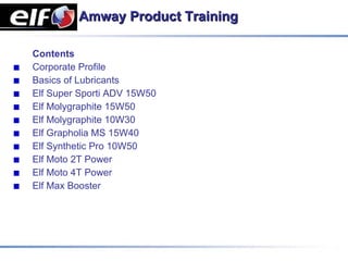 This document provides an overview of Elf lubricant products for motorcycles and automotive engines. It discusses the basics of lubrication and different types of lubricants including their composition and functions. Specific Elf products covered include Elf Super Sporti ADV 15W50, Elf Molygraphite 15W50, Elf Molygraphite 10W30, Elf Grapholia MS 15W40, Elf Synthetic Pro 10W50, Elf Moto 2T Power, and Elf Moto 4T Power.