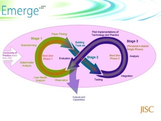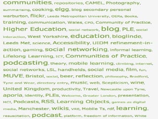 The document discusses objectives for supporting the formation of an effective and sustainable community of practice (CoP) through the use of social software and community tools. The objectives are to: 1) support the JISC in forming the CoP; 2) provide infrastructure and tools for the CoP; 3) support the CoP through activities like workshops and training events; and 4) support development of new learning and teaching technologies. It aims to have groups share ideas to develop interrelated projects and for the community to guide, support, and facilitate its own formation and emergence.