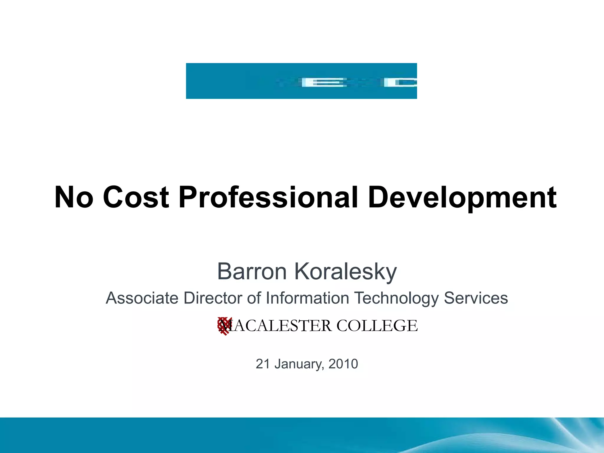 This document summarizes Macalester College's efforts to provide low-cost or no-cost professional development opportunities for faculty through collaboration with other local colleges and institutions. It describes how Macalester organized an instructional technology symposium with 11 other colleges that was well-received. The event increased collaboration between institutions and connected them with larger professional networks. It also lists other existing Minnesota higher education collaboration events.