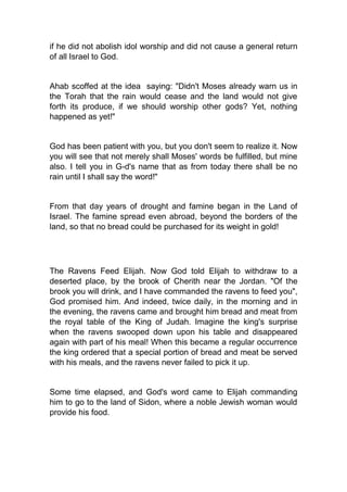 Elijah was a prophet in the 9th century BCE who defended the worship of Yahweh against King Ahab and Queen Jezebel's promotion of Baal worship. Elijah predicted a drought to prove God's power, hiding from Jezebel and being fed by ravens. He later confronted Ahab and the prophets of Baal on Mount Carmel, building an altar and calling down fire from heaven to prove Yahweh's power when the prophets of Baal failed, which ended the drought. Elijah is now remembered in Jewish traditions as the guardian of newborn boys and having a role in Passover seders.