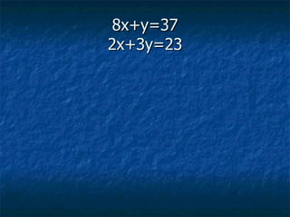 This document solves a system of two linear equations with two unknowns, x and y, to find the solution (x,y). It multiplies the first equation by 2 and the second equation by 8 to make the coefficients of x and y in both equations the same. It then subtracts the equations to isolate y and solves for y=5. Plugging y=5 back into the first equation, it solves for x=4. Therefore, the solution to the system is (x,y) = (4,5).