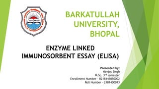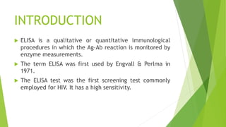 The document discusses enzyme-linked immunosorbent assay (ELISA), including its introduction, principle, equipment, procedure, types, advantages, and disadvantages. ELISA is a qualitative or quantitative immunological procedure that detects antigens or antibodies using enzyme-labeled antibodies and chromogenic substrates. It relies on antibody-antigen interactions and uses an enzyme-labeled antibody to generate a colored reaction, allowing detection of a particular antigen. The document outlines the basic equipment, general procedure involving coating wells with antibodies and adding samples and enzyme-labeled antibodies, and the three main types of ELISA - indirect, sandwich, and competitive.