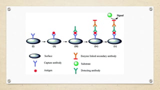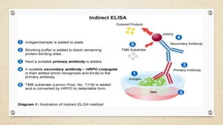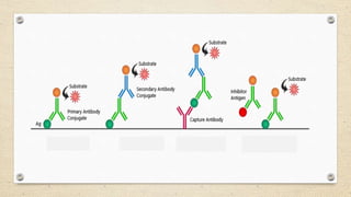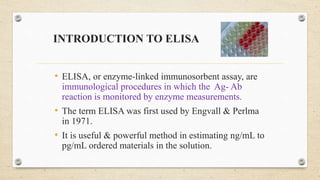 The document provides a detailed overview of the enzyme-linked immunosorbent assay (ELISA), including its definition, historical context, and various formats such as direct, indirect, sandwich, and competition ELISA. It describes the advantages of each type, such as increased sensitivity and specificity, and explains the underlying principles and procedures for conducting the test. Additionally, it highlights the common reagents and chromogenic substrates used in ELISA, notably the popularity of certain substrates for enhancing sensitivity.