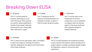 Enzyme-linked immunosorbent assay (ELISA) is a versatile biochemical technique used for the detection and quantification of biomolecules, particularly antibodies and antigens, with high sensitivity and specificity. It has important applications in clinical diagnostics, food safety, and research, allowing for the analysis of diseases such as HIV and COVID-19. Different types of ELISA include direct, indirect, and sandwich formats, each with unique methodologies for accurately measuring target analytes.