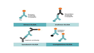 ELISA (enzyme-linked immunosorbent assay) is a technique used to detect and quantify specific proteins, antibodies, or antigens using enzymes linked to antibodies or antigens. There are four main types of ELISA: direct, indirect, sandwich, and competitive, each with distinct methodologies and applications in diagnostics, vaccine development, food and environmental safety. Despite its advantages, ELISA has limitations including specificity, sensitivity, time consumption, and dependency on operator and equipment.