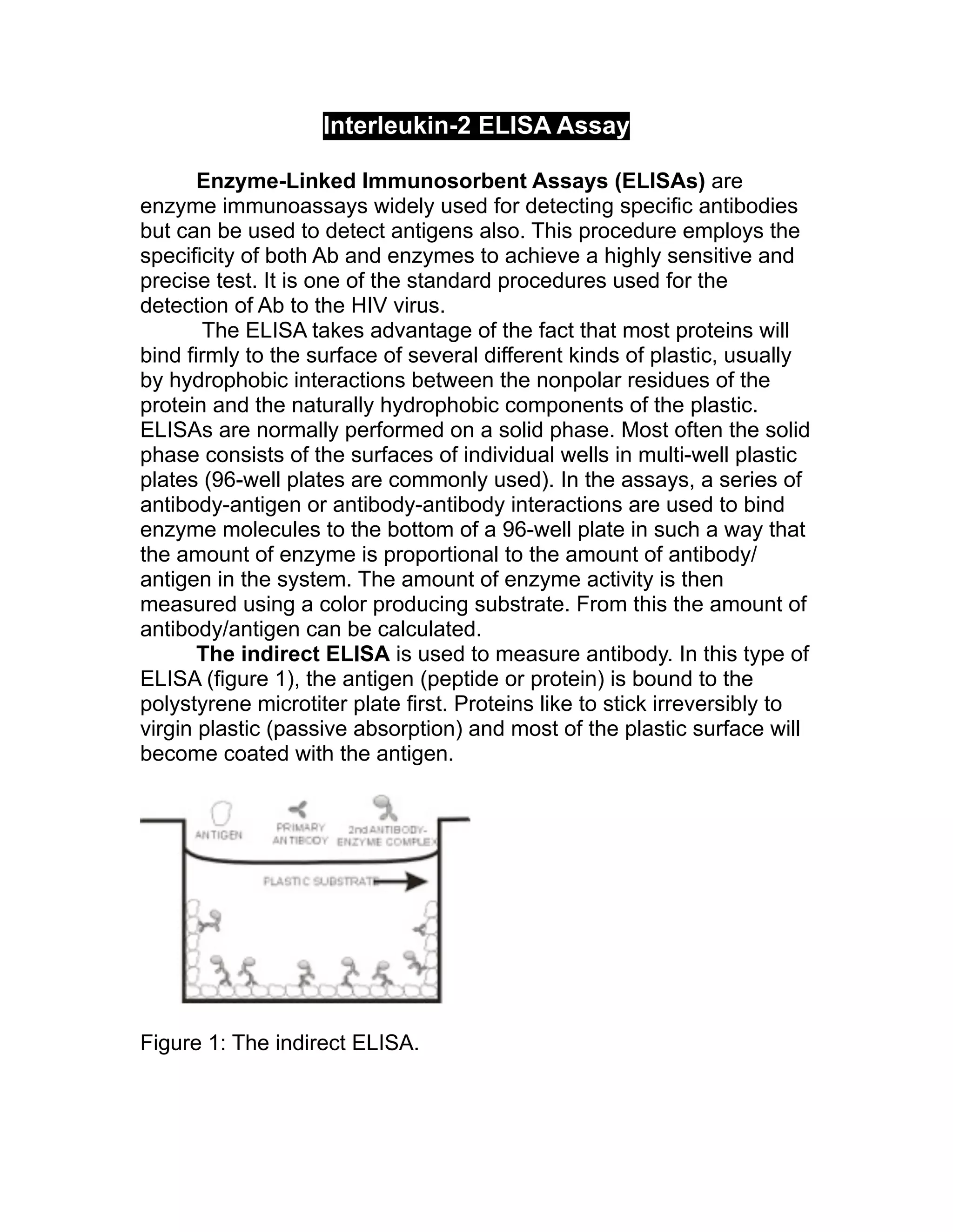 This document describes an enzyme-linked immunosorbent assay (ELISA) procedure to quantify levels of the cytokine interleukin-2 (IL-2) in a sample. It provides background on ELISA methods and the role of IL-2. The procedure involves coating a microtiter plate with capture antibodies, adding IL-2 standards and an unknown sample, detecting bound IL-2 with a detection antibody and enzyme conjugate, and generating a standard curve to calculate the concentration of IL-2 in the unknown based on absorbance readings. The objectives are to understand how ELISA works, compare ELISA methods, and learn about the role of IL-2.