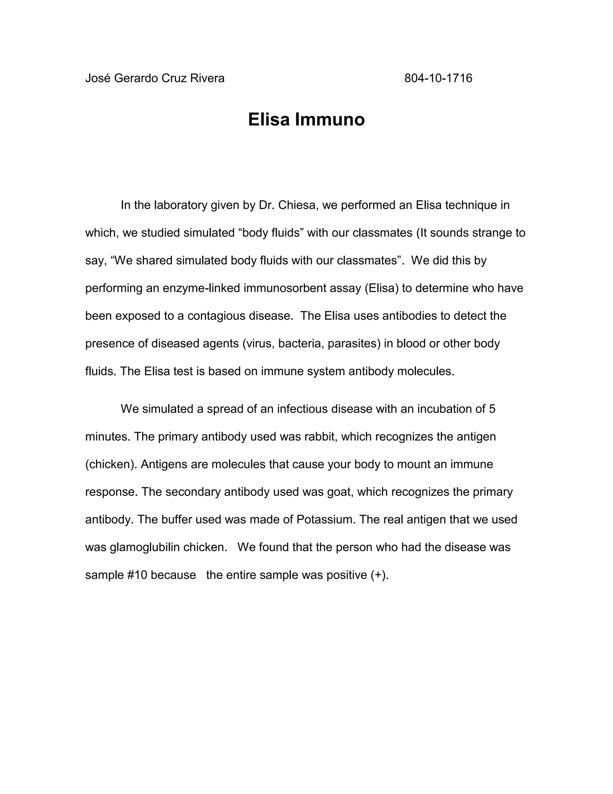 The student performed an ELISA technique in their laboratory class to simulate the spread of an infectious disease. The ELISA uses antibodies to detect disease agents in body fluids. In this simulation, the primary antibody was rabbit which recognized the chicken antigen, while the secondary antibody was goat which recognized the primary rabbit antibody. By testing sample #10 which came up positive, they determined that sample belonged to the person exposed to the contagious disease in the 5 minute incubation period.