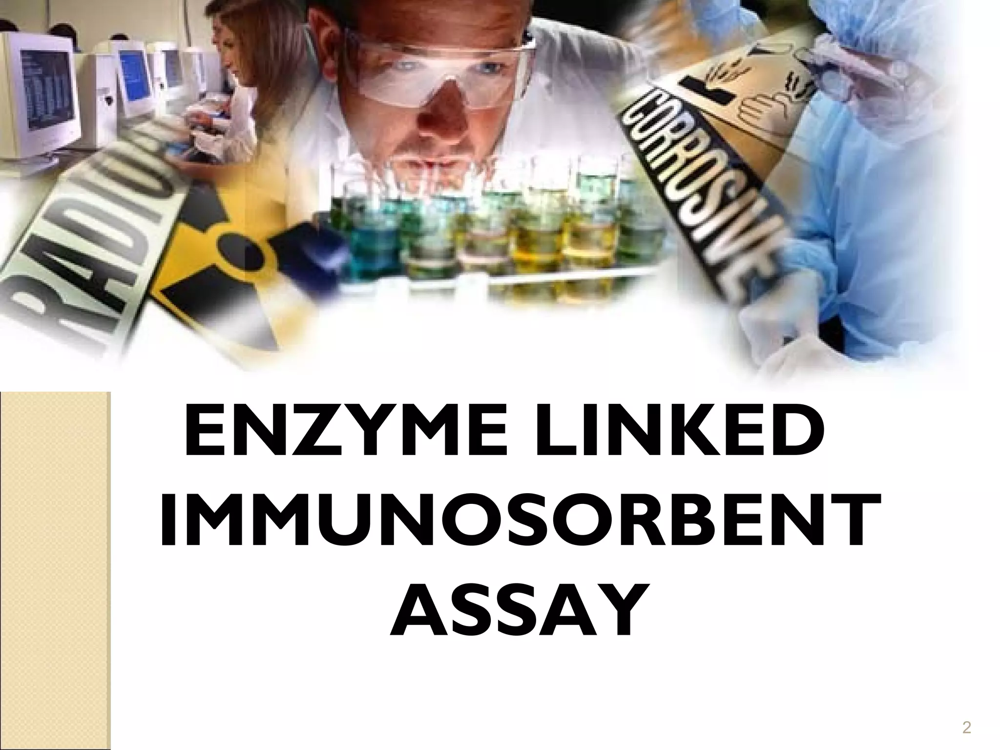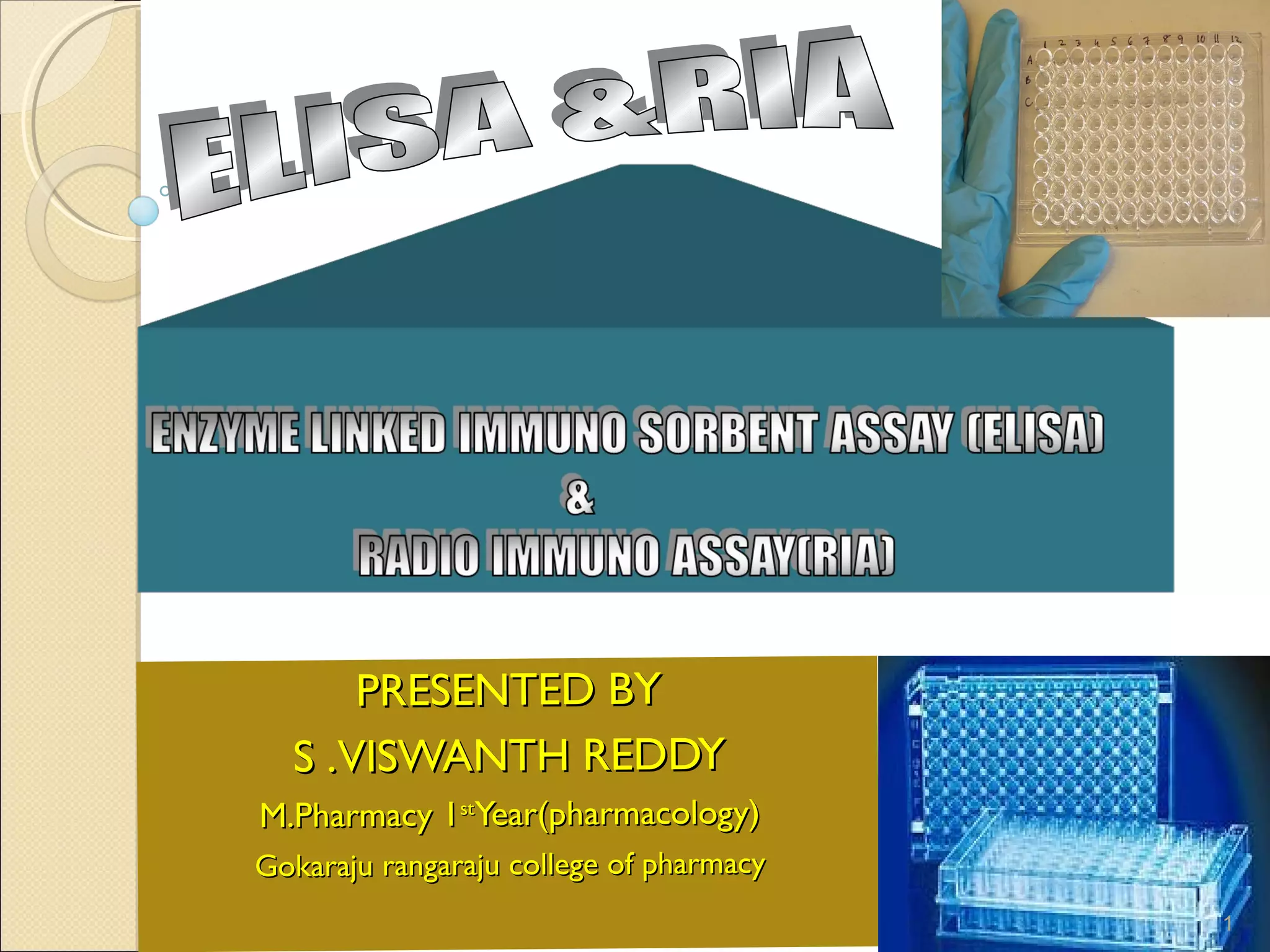 The document provides an overview of the ELISA (enzyme-linked immunosorbent assay) technique. It discusses the principle, basic procedure, materials needed, types (indirect, sandwich, competitive), advantages, disadvantages, and applications of ELISA. ELISA is a sensitive and specific quantitative immunological technique used to detect antigens, antibodies, or other proteins in biological samples. It has various applications in detecting hormones, proteins, infectious agents, and for vaccine quality control among others.