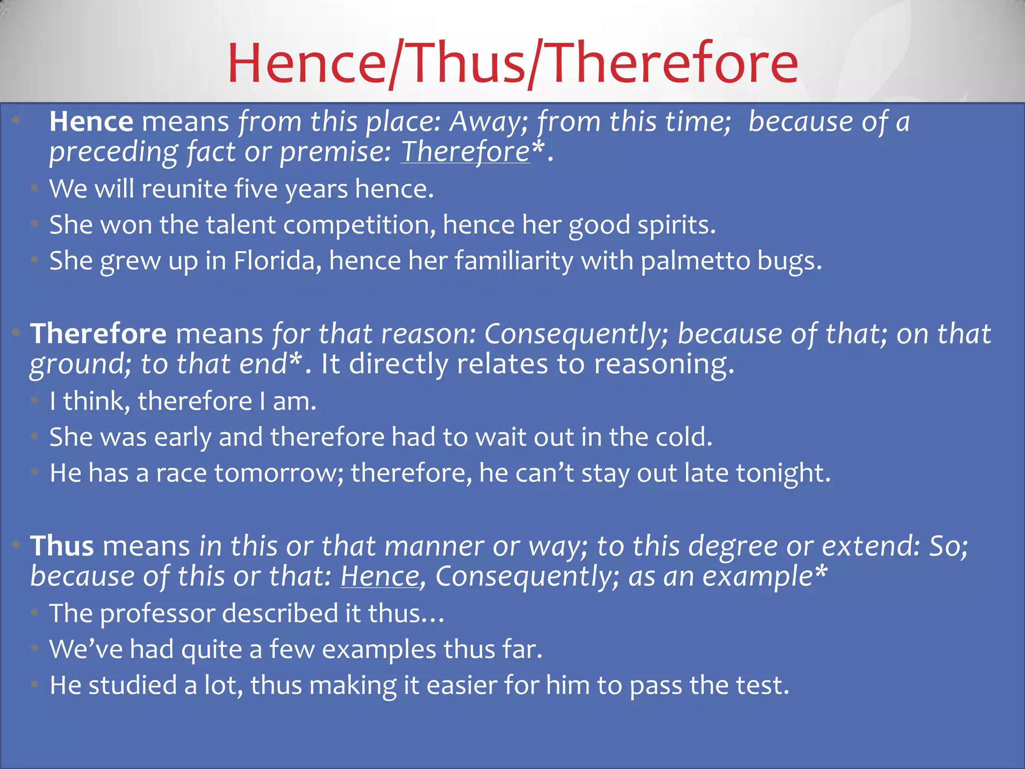 This document provides definitions and examples of the terms "hence", "thus", and "therefore". Hence means from this place or because of a preceding fact. It is used to indicate a consequence or result. Thus means in this or that manner or way, as an example. It is used to draw a comparison or parallel. Therefore means for that reason or because of that, and directly relates to reasoning by presenting a conclusion based on preceding statements or known facts. The document provides examples of sentences using each term to demonstrate their meanings.