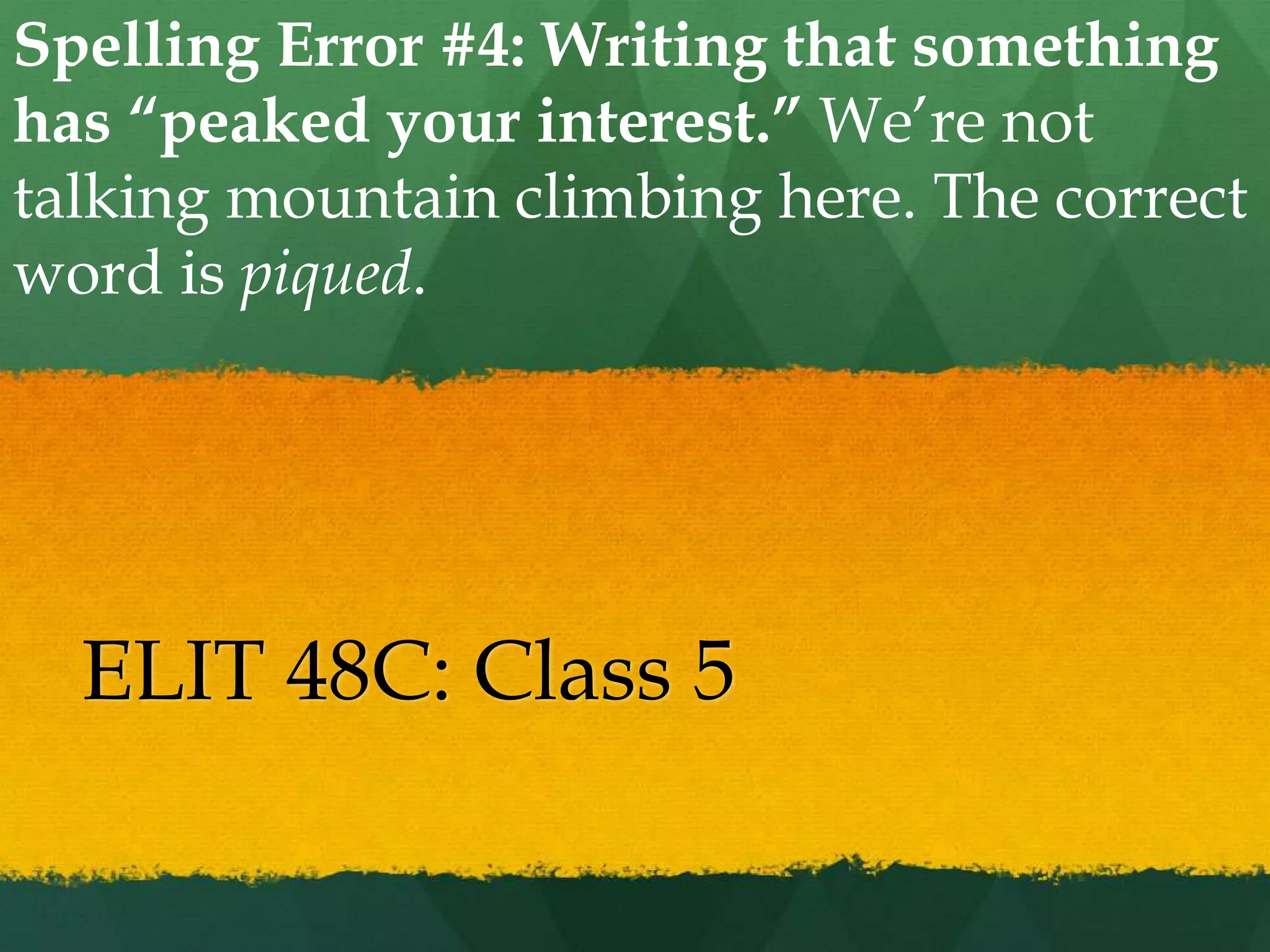 This document discusses common homophone spelling errors, providing examples of "peek", "peak", and "pique" and their correct meanings and usages. It notes that "piqued" is the correct word to use when something has piqued one's interest, not "peaked". It then provides a nonsensical sentence combining all three words to illustrate their differences: "I knew a peek at the peak would pique my curiosity."