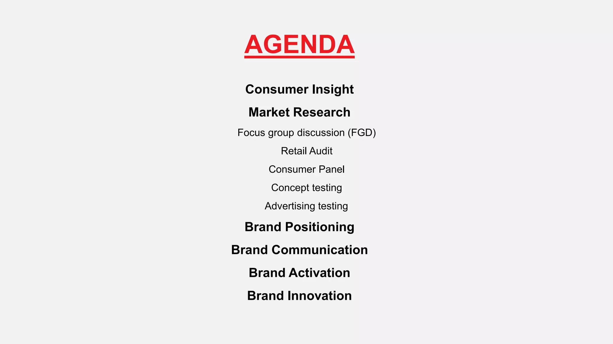 This document provides an overview of key concepts in brand strategy and market research. It begins by defining consumer needs, wants, and desires. It then discusses insights, truth, and opportunities. The rest of the document covers various market research techniques including focus groups, retail audits, consumer panels, concept testing, and advertising testing. It also discusses how to develop a brand key, brand positioning, integrated brand communication, and how to develop communication ideas. The overall summary is that the document outlines important concepts for understanding consumers and developing an effective brand strategy through market research and communication.