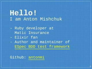 This document provides an overview of Elixir and functional programming presented by Anton Mishchuk at an Elixir meetup. It discusses the software crisis driven by increasing hardware capabilities, the resurgence of functional programming like Erlang to address this, and how Elixir builds upon Erlang with a Ruby-like syntax and metaprogramming capabilities. While sharing a "programmer happiness" philosophy with Ruby, Elixir differs in being functional and using Erlang's actor model for concurrency over mutable state and threads. The presentation encourages trying Elixir to build software for modern multicore systems and IoT given these advantages.