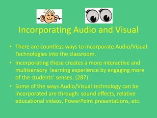This document discusses ways to incorporate audio and visual technologies into classroom presentations and teaching to engage students with different learning styles. It provides examples of incorporating sounds effects, videos, and PowerPoint into lessons. The document also discusses using audio recordings and listening activities. For visual teaching, it recommends using objects, photos and printed materials. It concludes by offering tips for creating an effective presentation, such as conducting research, understanding the audience, and including visuals, audio activities and fun elements to create an engaging learning experience.