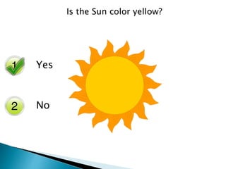 Ang dokumento ay naglalaman ng mga simpleng tanong at sagot na nauugnay sa mga kulay, partikular sa mga bagay tulad ng araw, bulaklak, at mga prutas. Tinatasa nito ang kaalaman ng mga mag-aaral sa mga kulay ng bagay-bagay. Ito ay tila isang bahagi ng mga aktibidad para sa ikatlong baitang ng Lunsad Elementary School.