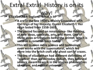 This document provides an overview of Elizabethan England in 3 sections. It first discusses key historical figures of the period like Queen Elizabeth I and explorers like Walter Raleigh. It then examines the flourishing of arts and architecture during this time, particularly the works of William Shakespeare. Finally, it outlines aspects of everyday life for both the wealthy and peasants in Elizabethan society.