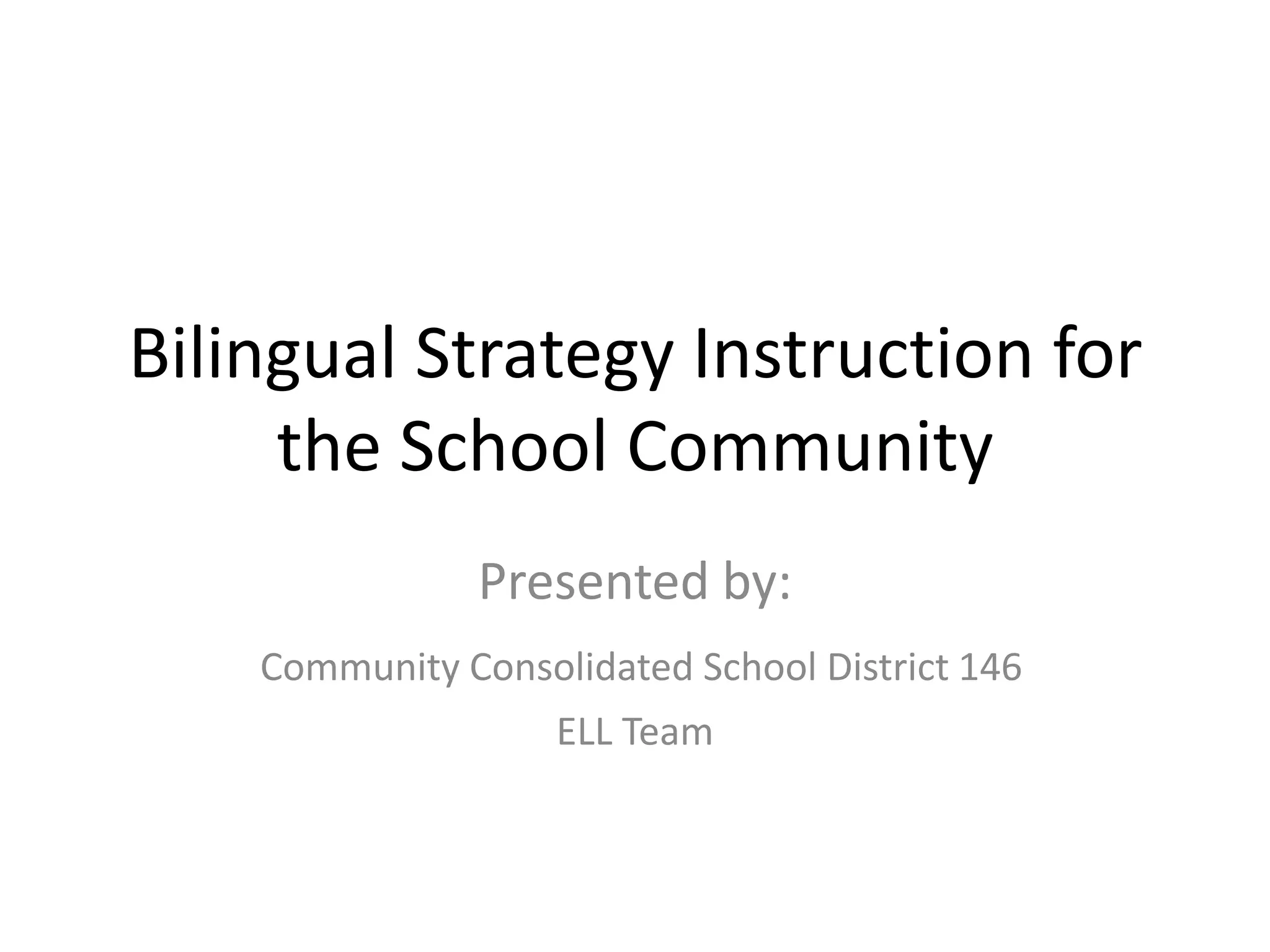 This document summarizes a presentation given by the ELL Team of Community Consolidated School District 146. It discusses the district's demographics, including the predominant languages spoken. It describes book studies and resources the team has used to establish a philosophical base for bilingual instruction. Examples of literacy projects for Arabic and Latino families are provided. Videos and materials for parents to help with homework and school registration are mentioned. Key elements of effective instruction for English Learners from a research article are listed at the end.