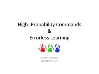 3) The steps to implement high-probability commands are to select easy commands, present them rapidly with reinforcement, then immediately present and reinforce a low-probability command. The steps to implement errorless learning techniques involve systematically fading prompts over time.