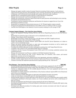 Elliot Wojcik has over 15 years of experience in business operations, field service, customer relations, and logistics. He is currently the Parts Supply Manager at Coca-Cola Refreshments in New York where he is responsible for parts supply chain management and inventory controls totaling over $9 million. Prior to this role, he held positions as Customer Support Manager and Parts Manager where he oversaw parts inventory, purchasing, and key performance indicator reporting. He has a strong background in leadership, planning, continuous improvement, and developing people.