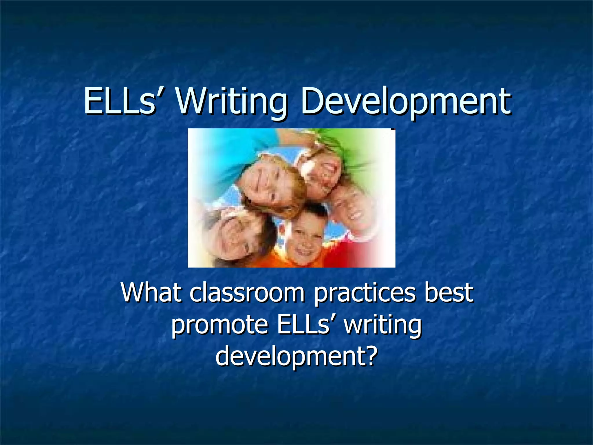 This document discusses strategies to promote writing development for English language learners (ELLs) in 4th grade. It recommends using graphic organizers, modeling exemplary writing, using rubrics, and portfolio assessment. Graphic organizers can help ELLs brainstorm ideas and understand vocabulary. Modeling involves demonstrating the writing process. Rubrics clarify expectations. Portfolios allow students and teachers to track progress over time. Essential questions encourage higher-order thinking. The strategies connect to state, national, and technology standards.
