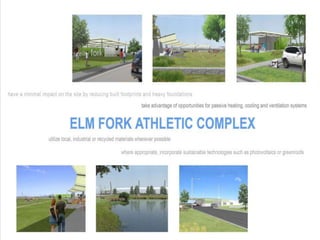 The Elm Fork Athletic Complex in Dallas is undergoing a phased construction plan, with Phase 1 focusing on developing soccer fields and necessary facilities, including a maintenance building and restroom pavilions. The total budget for the project is $39 million, with $19 million allocated for land acquisition and construction in Phase 1. The master plan also includes amenities such as a concession facility, parking for 700 cars, and connections to a regional trail network.