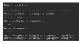 The document discusses the Elm programming language and its features such as functional programming concepts, including immutable data, first-class functions, and pure functions. It also mentions the Elm architecture and provides a simple 'Hello, World!' example. The text reflects the author's personal views and includes a light-hearted tone throughout.
