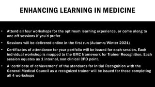 This document describes a programme consisting of four workshops to enhance learning for those involved in teaching and supervising medical students and doctors in training. Attendees can attend all four workshops for the full learning experience or individual sessions. Certificates will be issued for each session attended and for completing all four workshops. The workshops will cover designing learning, facilitating learning, supporting learning, and assessing learning.