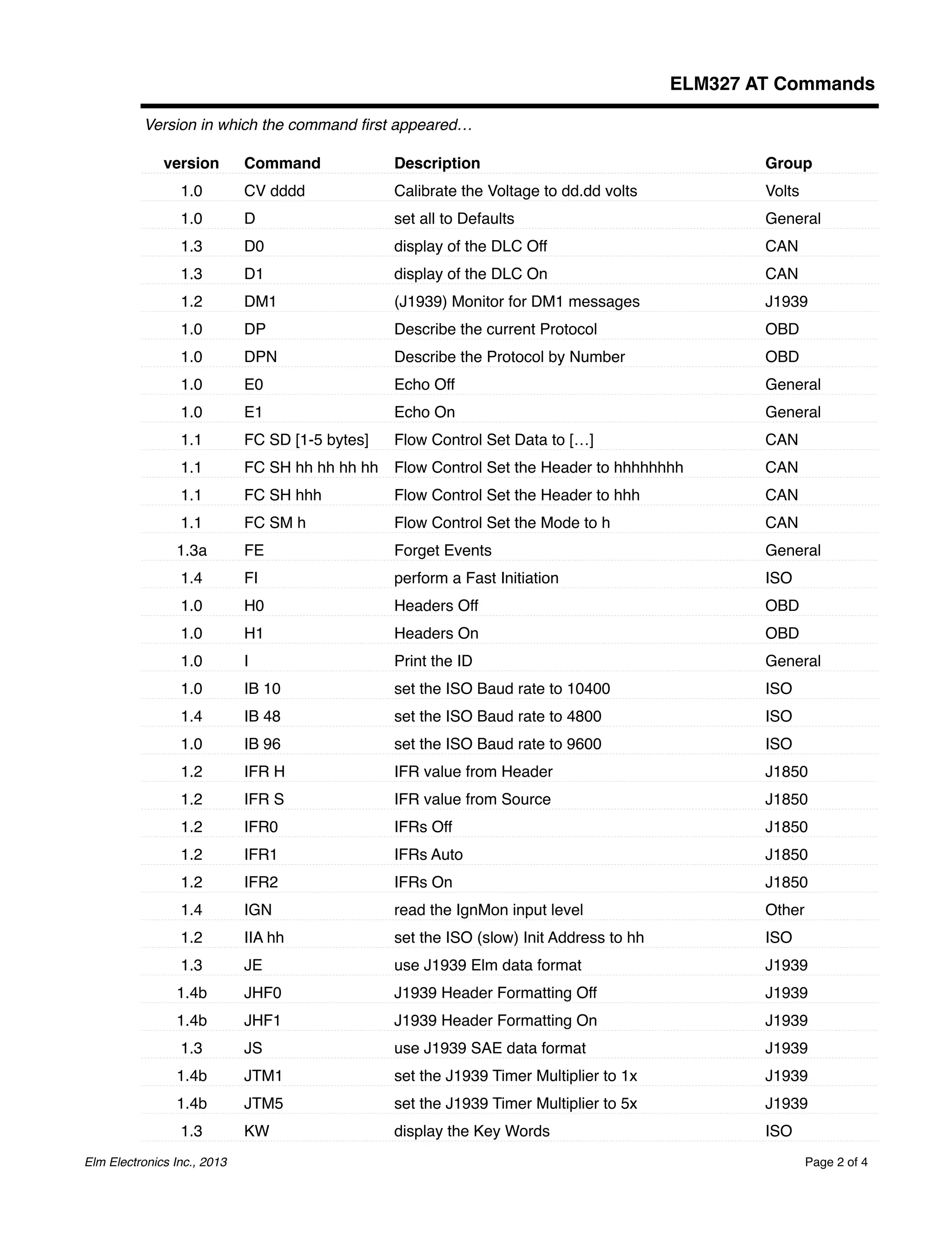 This document lists AT commands for the ELM327 device, including the version the command was introduced, a description of the command, and the command group. It includes commands for general device functions, OBD operations, CAN bus, ISO, J1939, and other specialized functions. The commands allow configuring options like baud rate, protocol, headers, filtering, and more.
