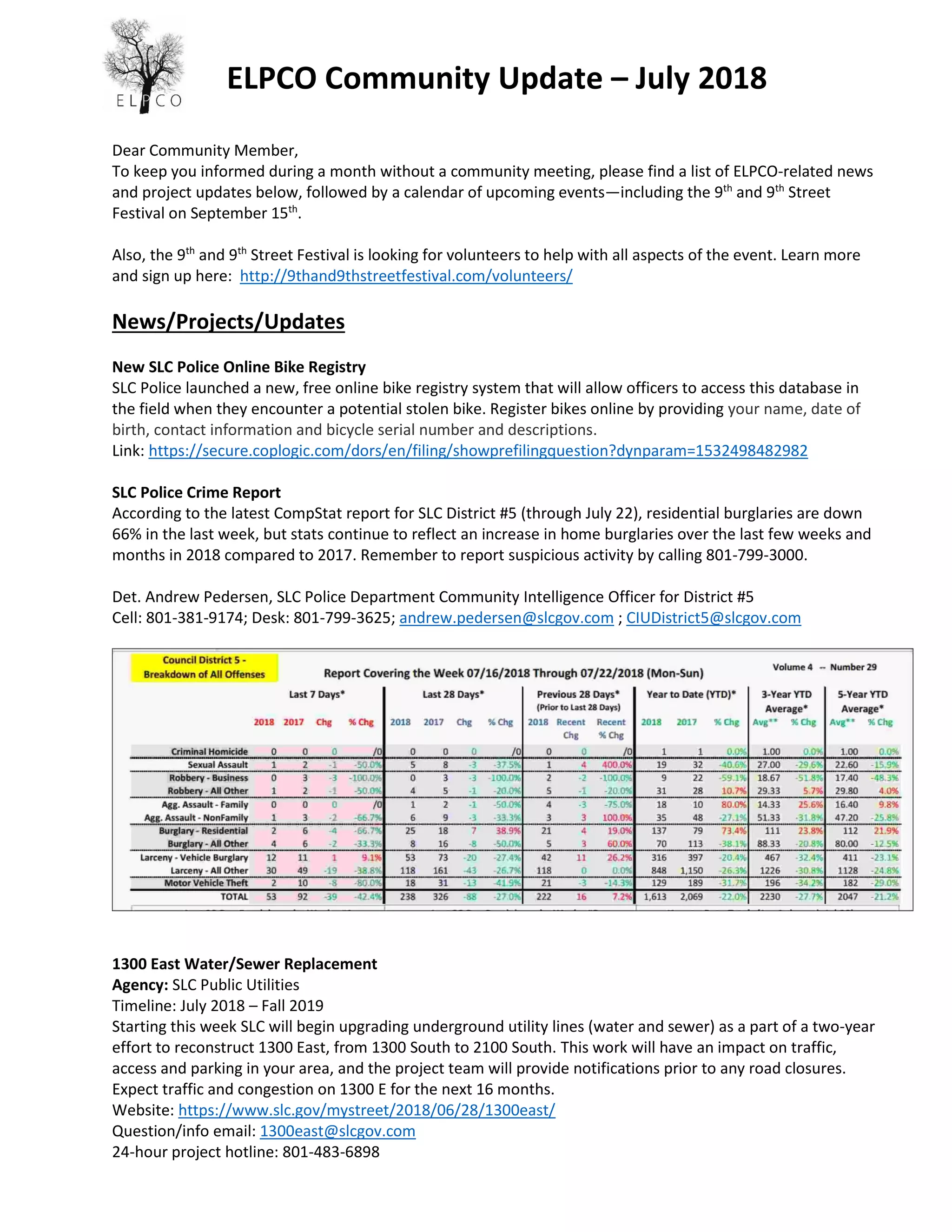The document provides updates on projects and events in the ELPCO community of Salt Lake City. It announces the launch of a new online bike registry by the SLC Police Department, updates on home burglary rates, and a major water and sewer replacement project on 1300 East expected to last until fall 2019. Upcoming community events include National Night Out on August 7th, the 9th and 9th Street Festival volunteer signups and the event on September 15th, and the monthly ELPCO community meeting on August 23rd.