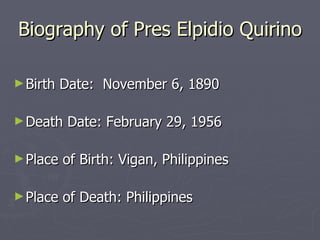 Elpidio Quirino was the second president of the postwar Philippines. He was born in 1890 in Vigan, Ilocos Sur and served in various political roles including representative, senator, and secretary of finance and interior before becoming vice president in 1946 and then president in 1948 after Manuel Roxas' death. As president, he oversaw postwar reconstruction efforts but faced threats from the communist Huk rebellion and issues of corruption. He lost reelection in 1953 and died in 1956.