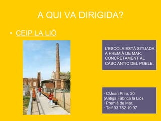 A QUI VADIRIGIDA? CEIP LA LIÓ L’ESCOLA ESTÀ SITUADA A PREMIÀ DE MAR, CONCRETAMENT AL CASC ANTIC DEL POBLE. · C/Joan Prim, 30 (Antiga Fàbrica la Lió) · Premià de Mar. · Telf.93 752 19 97