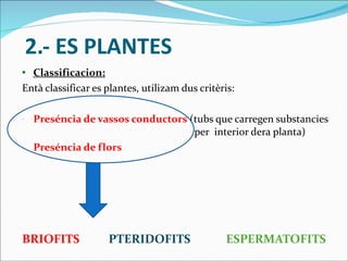 2.- ES PLANTESClassificacion: Entà classificar es plantes, utilizam dus critèris: Preséncia de vassos conductors (tubs que carregen substancies per interior dera planta) Preséncia de flors BRIOFITS PTERIDOFITS ESPERMATOFITS