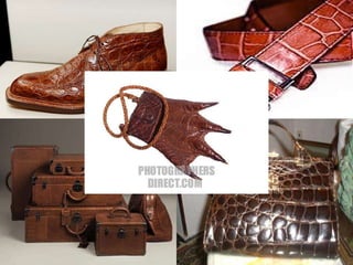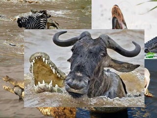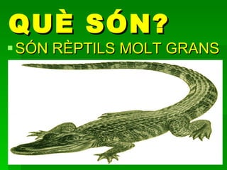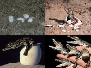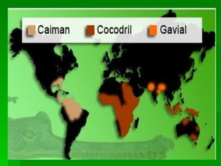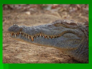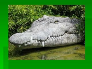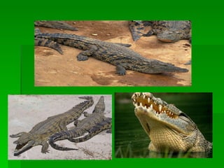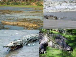 Cocodrils are large reptiles covered in bony plates on their backs and tails and scales on their sides. They have short legs with webbed digits and powerful jaws and sharp teeth used to catch and hold prey without chewing. Cocodrils live in rivers, lakes, swamps and other freshwater and saltwater habitats in warm countries, preying on various animals and even humans by ambushing them at water's edge. Females lay between 20 to 60 eggs which they bury and guard until hatching.