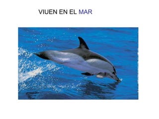 Els dofins són mamífers marins que viuen en grup i no són peixos. S'alimenten de peixos, calamars i marisc, i quan són petits, beuen llet de la seva mare. Tenen un espiracle per respirar i es comuniquen entre ells.