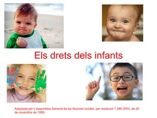 Principi 1 L'infant ha de gaudir de tots els drets enunciats en aquesta Declaració. Aquests drets han de ser reconeguts a tots els infants sense excepció de cap mena o discriminació per motius de raça, de color, de sexe, de llengua, de religió, d'opinió política o d'altra índole, d'origen nacional o social, posició econòmica, de naixement o de qualsevol altra condició, ja sigui de l'infant mateix o de la seva família.