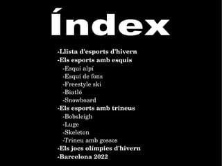 Això és un recull dels esports d'hivern com l'esquí, l'snowboard, els trineus... En aquesta presentació hi explico en que consisteix cada esport i explico de que van els jocs olímpics d'hivern. També hi ha informació sobre els jocs olímpics del 2010 i sobre la candidatura de Barcelona 2022.