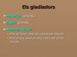 Els gladiadors 1. 2. Els gladiadors Material: coixins. Espai: gimnàs. Normes de joc: S’ha de lluitar amb els coixins per davant. Perd el que posa un peu a fora del cercle marcat. 3. Els gladiadors Com es juga ? Es marca un cercle al terra en el qual s’hauran d’enfrontar dos soldats. Es faran servir coixins perquè no es facin mal. El joc consisteix en fer fora del cercle al rival. Quan s’aconsegueix tres vegades es guanya.