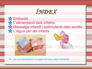 ÍNDEX Embaràs L'alimentaciódels infants Massatge infantil i estimulació dels sentits L'aigua per als infants (per anar directament a la página del tema, pitjeu l'estrelleta)