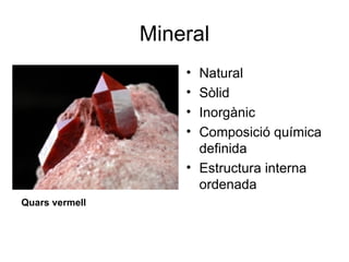 Menes metal·liques Menesde ferro : hematites, magnetita, limonita, siderita Menes de coure : calcopirita, cuprita Mena de plom : galena Mena de zinc : blenda (esfalerita) Mena d’ alumini : bauxita Mena d’ urani : uraninita Mena d’ estany : cassiterita Mena de mercuri : cinabri Mena de manganès : pirolusita, psilomelana