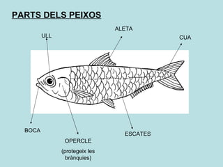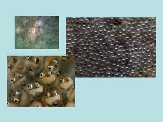 The document discusses the anatomy, habitat, diet, and reproduction of fish. It notes that fish have fins, scales, tails, eyes, and mouths. They breathe through gills, with water entering the mouth and exiting through the gills. Fish live underwater in freshwater rivers, lakes, or saltwater seas. They eat algae and other fish. Female fish lay eggs in water and then the male spreads magical dust on the eggs, which hatch into baby fish that grow inside the egg until they emerge.