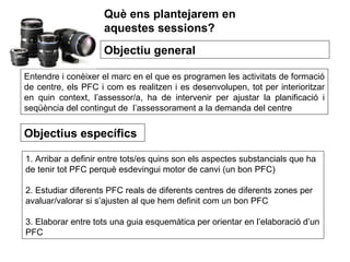 Entendre i conèixerel marc en el que es programen les activitats de formació de centre, els PFC i com es realitzen i es desenvolupen, tot per interioritzar en quin context, l’assessor/a, ha de intervenir per ajustar la planificació i seqüència del contingut de l’assessorament a la demanda del centre Objectiu general Què ens plantejarem en aquestes sessions? Objectius específics 1. Arribar a definir entre tots/es quins son els aspectes substancials que ha de tenir tot PFC perquè esdevingui motor de canvi (un bon PFC) 2. Estudiar diferents PFC reals de diferents centres de diferents zones per avaluar/valorar si s’ajusten al que hem definit com un bon PFC 3. Elaborar entre tots una guia esquemàtica per orientar en l’elaboració d’un PFC