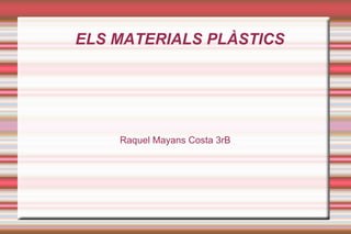INTRODUCCIÓ: Que sónels plàstics? Són materials orgànics polimèrics d'alta massa molecular. Són molècules gegants forma- des per àtoms de carboni junta-ment amb altres d'hidrogen, oxigen, i en menor mesura, clor, fluor, nitrogen o silici. Els plàstics són sòlids amorfs, sintètics o semisintètics, que tenen una gran utilitat per a la indústria.