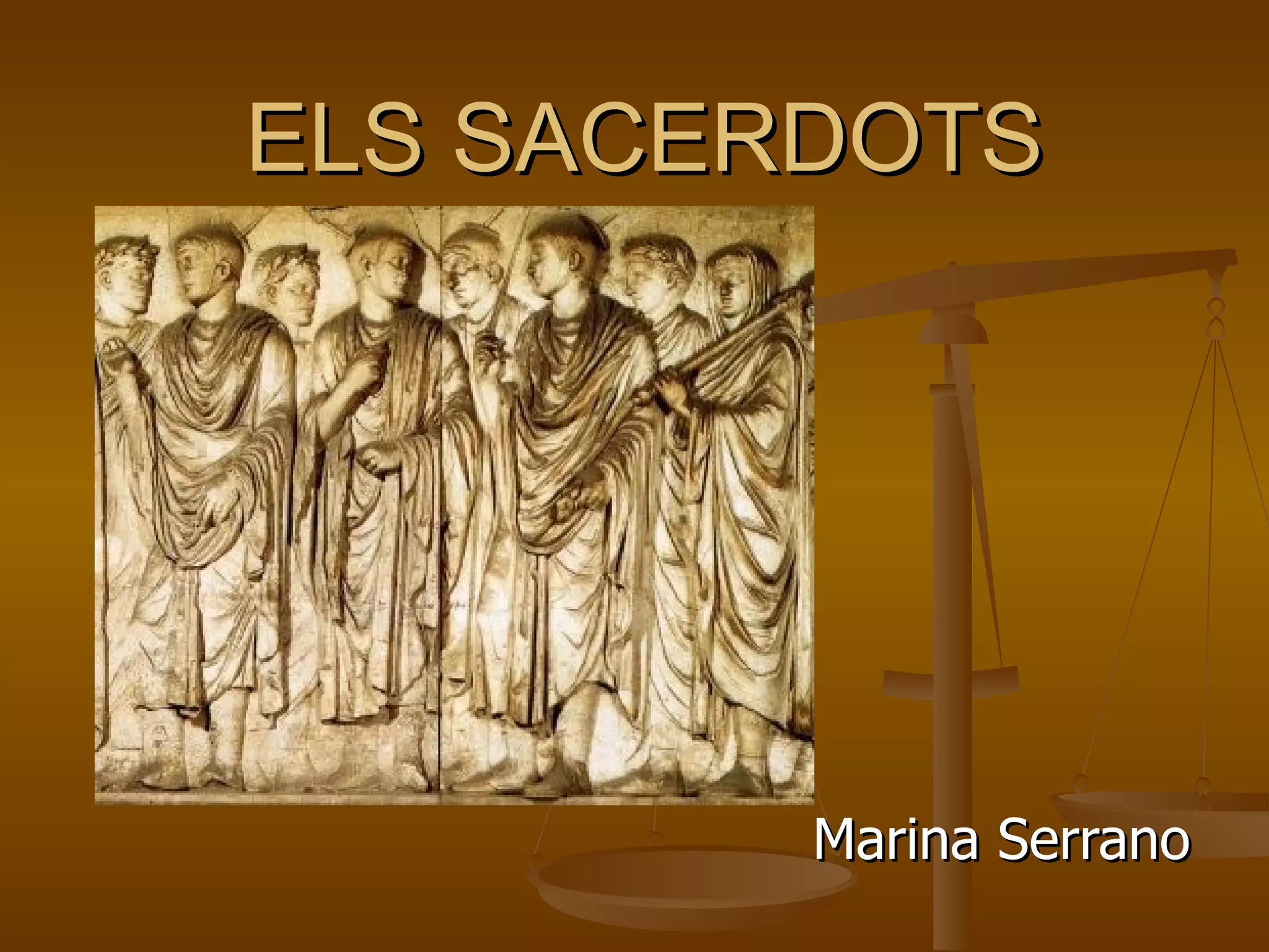 Els sacerdots erenmolt nombrosos s’agrupaven en col·legis; alguns eren més importants i eren més respectats pels altres. Tipus de sacerdots: Els flàmens eren sacerdots consagrats al culte d’un determinat déu. Els tres flàmens més importants eren els que s’ocupaven de Júpiter, Mart i Quirí.