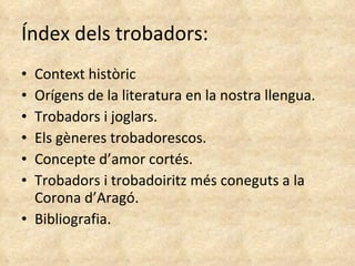 Índex dels trobadors:Context històric Orígens de la literatura en la nostra llengua. Trobadors i joglars. Els gèneres trobadorescos. Concepte d’amor cortés. Trobadors i trobadoiritz més coneguts a la Corona d’Aragó. Bibliografia.