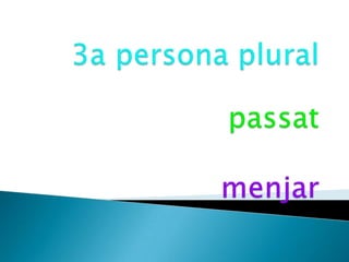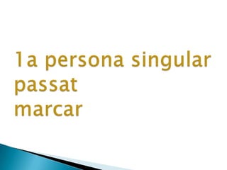 The document discusses various verbs related to different tenses and aspects of the Spanish language including the past, present, and future. It lists verbs like "passat", "present", "futur" and conjugates other verbs such as "pegar", "tancar", "borrar", and "tocar" for the first, second, and third person singular and plural in both the past and future tenses along with additional verbs like "saltar", "córrer", "cuinar", "somiar", "tallar", "menjar", "robar", "xiular", "navegar", and "explorar".