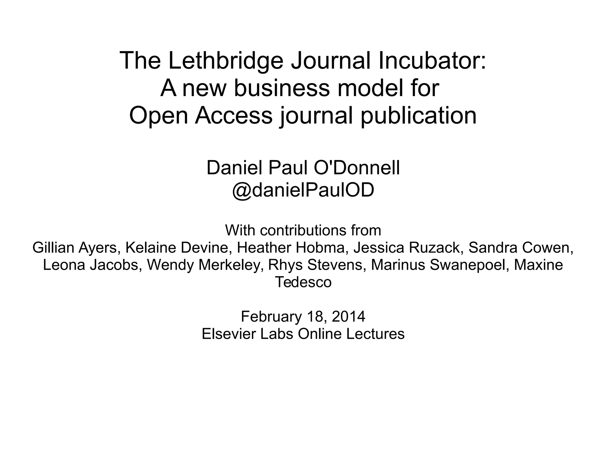 The Lethbridge Journal Incubator proposes a new business model for open access publication in the humanities, linking journal production to university research and teaching to enhance funding and accessibility. This approach aims to train students and improve institutional support while addressing the challenges of maintaining quality and funding in open access publishing. The incubator model emphasizes the importance of scalability and could potentially extend its benefits to scientific research as well.