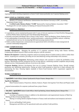 Mahmoud Mohamed Mahmoud EL-Shahed is seeking a career enriching role as a Senior Credit Analyst in corporate banking. He has over 4 years of experience in client portfolio management, credit analysis, and relationship management. Currently working as a Senior Credit Analyst at Banque Misr in the Islamic banking sector, he has experience managing a portfolio of 15 corporate clients and business development. He holds a Bachelor's degree in Commerce and Business Administration and is a Certified Lender Business Banker.